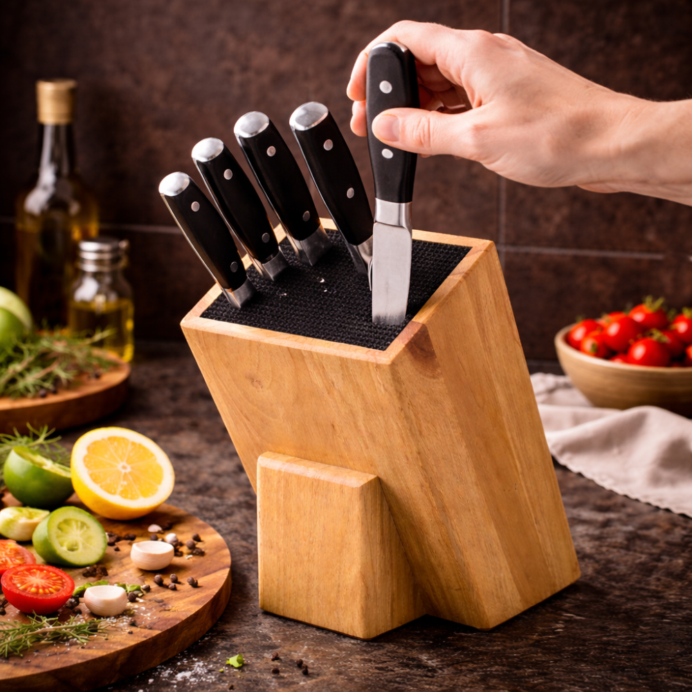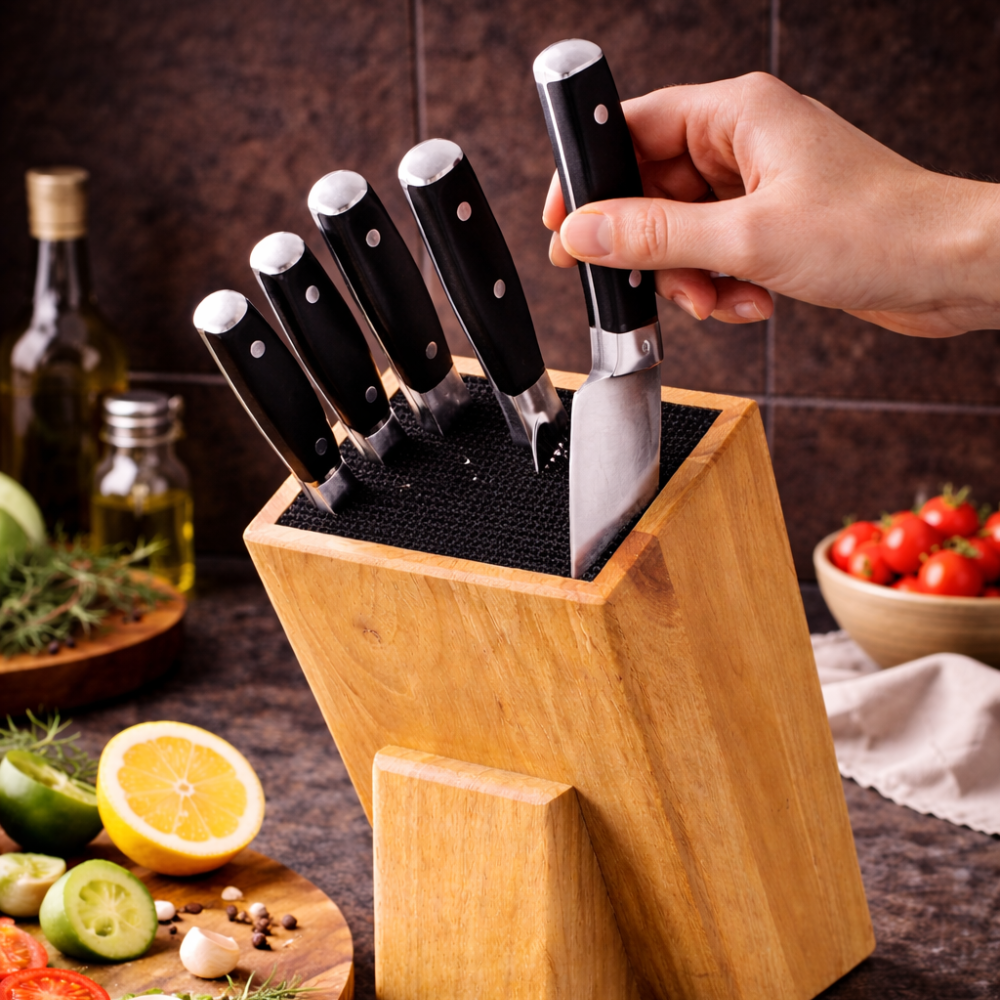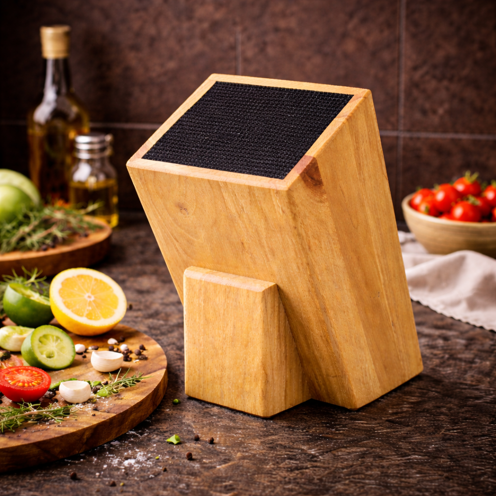 Der Messerblock ist stabil gebaut und bietet speziell geformte Fächer für unterschiedliche Klingenformen – vom Kochmesser über Brotmesser bis zum Universalmesser. So bleiben deine Messer geschützt und scharf, gleichzeitig wirkt deine Küche aufgeräumt und professionell. Perfekt für ambitionierte Hobbyköche und alle, die Wert auf Ordnung und Qualität legen.