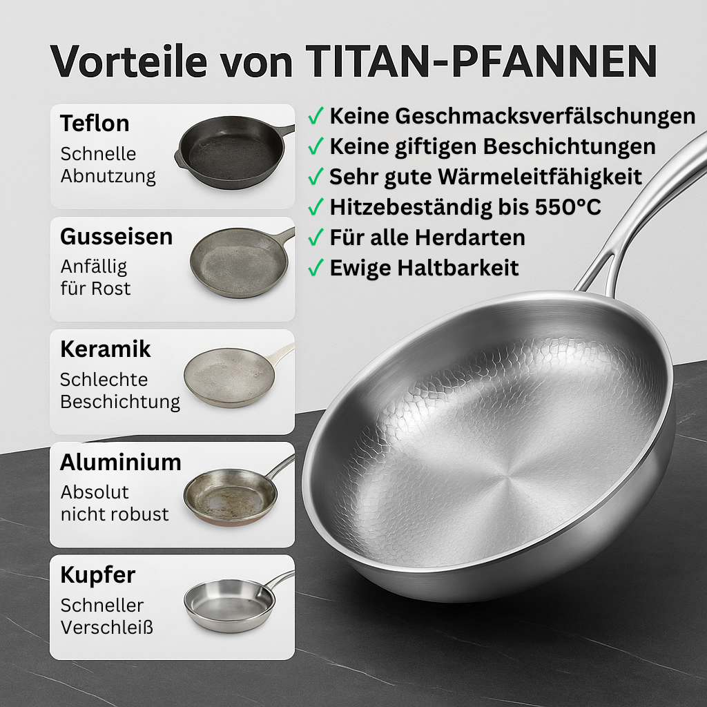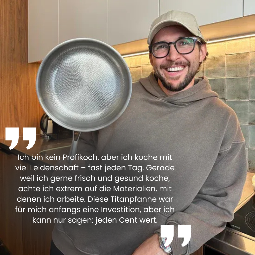 Kochen auf höchsten Niveau: Die TITAN-PREMIUM-PFANNE™ ist der Inbegriff von Leichtigkeit, Robustheit und exzellenter Wärmeverteilung. Gefertigt aus hochwertigem Titan, bietet diese Pfanne eine außergewöhnliche Haltbarkeit und ist bis zu 550°C hitzebeständig.