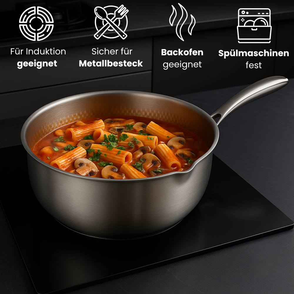 Kompromisslose Qualität gepaart mit absoluter Sicherheit Aus reinem Titan gefertigt ist es geschmacksneutral und frei von PTFE, PFOA und anderen Schadstoffen – ideal für gesundes Kochen. Seine extreme Hitzebeständigkeit bis 550 °C, die Eignung für alle Herdarten sowie die Spülmaschinenfestigkeit machen es zum zuverlässigen Begleiter in jeder Küche.