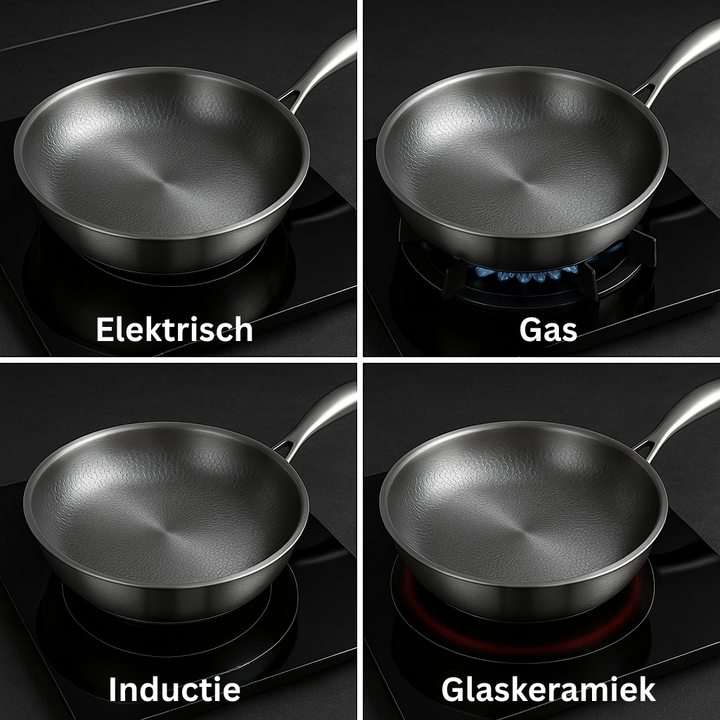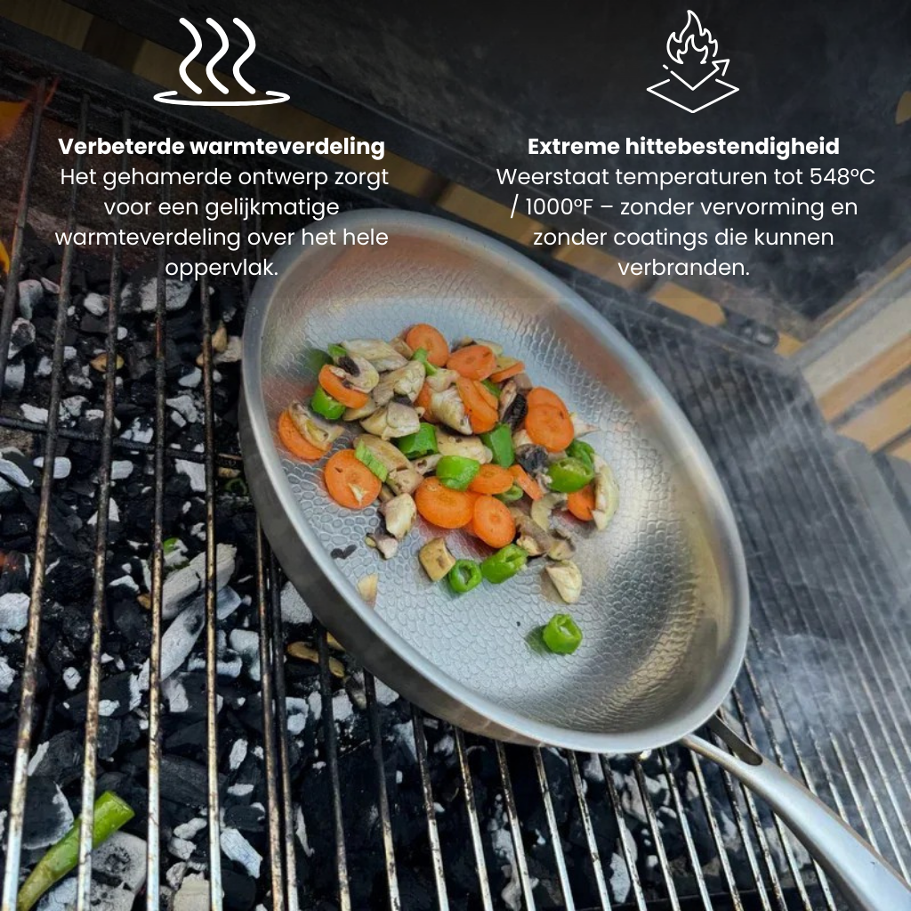 Dans un PREMIUM TITANIUM PAN™, toutes les parties des autres piqûres sont amenées à la table, après quoi les aiguilles sont éliminées. Pas de glissement, pas de torréfaction, pas de revêtements nocifs et ongelooflijk makkelijk te clean. Welke kookplaat je ook gebruikt — hij levier altijd culinaire topprestaties.