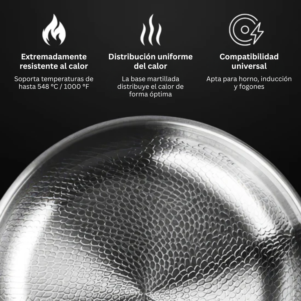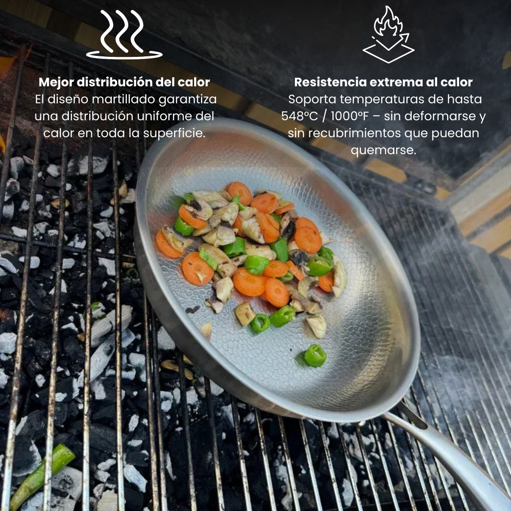 Le SARTÉN DE TITANIO PREMIUM™ est conçu pour une durabilité exceptionnelle et une conductivité thermique élevée, ce qui en fait un choix haut de gamme pour les utilisateurs exigeants. Sans revêtement, il convient à tous les types de cuisines.