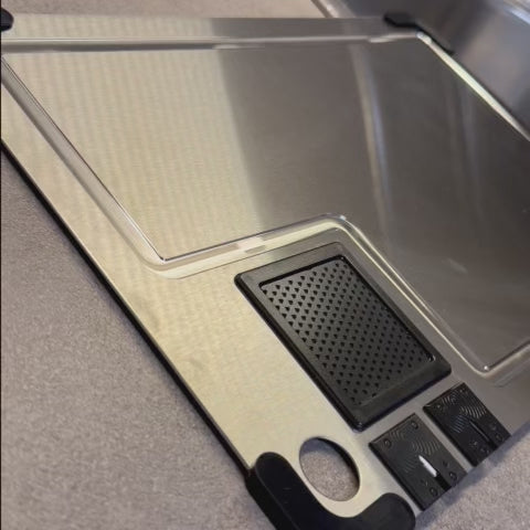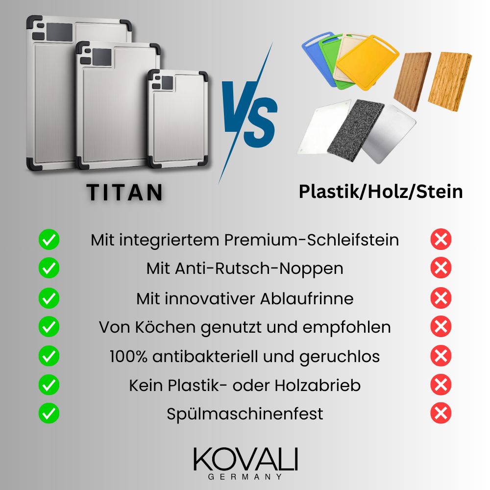 Das PROFI-TITAN-SCHNEIDEBRETT™ 3.0 mit integriertem Premium-Schleifstein, hochwertigen Anti-Rutsch-Noppen und innovativer Ablaufrinne vom Originalhersteller KOVALI™ hat alle bewährten Vorteile anderer Bretter in einem Schneidebrett vereint und es gleichzeitig geschafft, die Mängel und Nachteile anderer Bretter zu vermeiden.