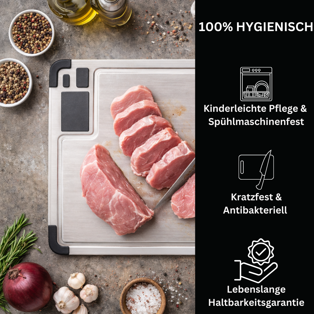 Das PROFI-TITAN-SCHNEIDEBRETT™ 3.0 garantiert eine antibakterielle Beschichtung ohne giftige Chemikalien, absorbiert Gerüche und es gibt endlich keinen Plastik- oder Holzabrieb mehr - für mehr Sauberkeit und Hygiene in Deiner Küche. Es macht zudem die Messer nicht stumpf und kann sogar in der Spülmaschine gereinigt werden.
